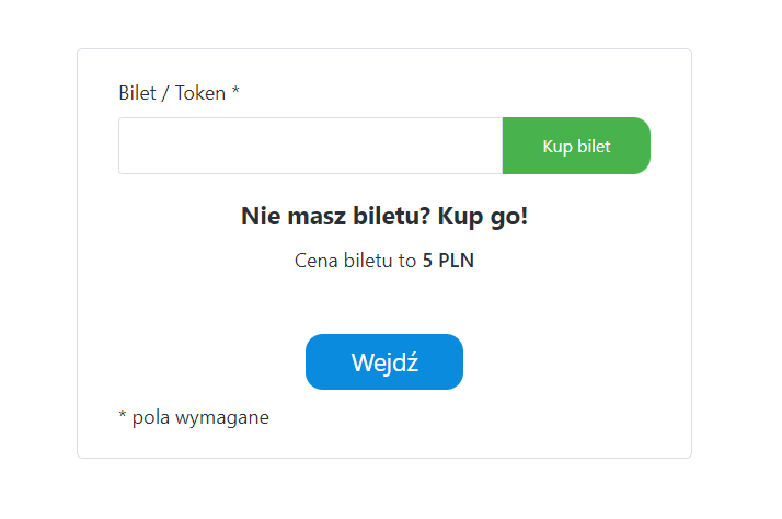 Po wejściu w link prowadzący do wydarzenia, oczom uczestnika ukaże się mini formularz z prośbą o wprowadzenie tokena.
