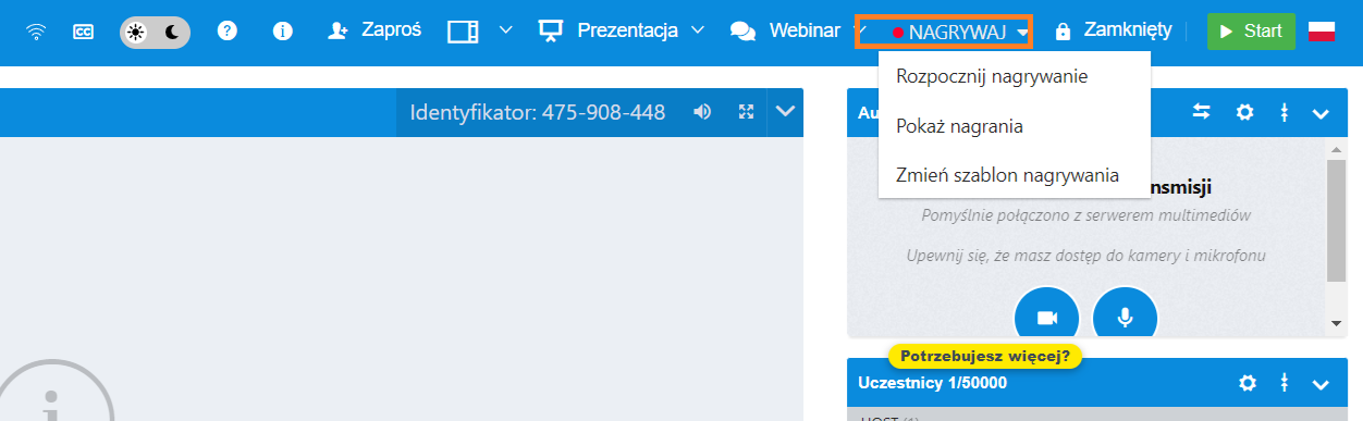 By rozpocząć nagrywanie, naciśnij przycisk „Nagrywaj” w górnym prawym rogu ekranu. Możesz wybrać szablon nagrywania – w tym układ okien używany przez nagrywarkę. Możesz także zmienić go w trakcie nagrywania. Ustawienie domyślnego układu znajdziesz w Panelu Konta. Nagrywanie możesz przerwać w dowolnym momencie spotkania.
