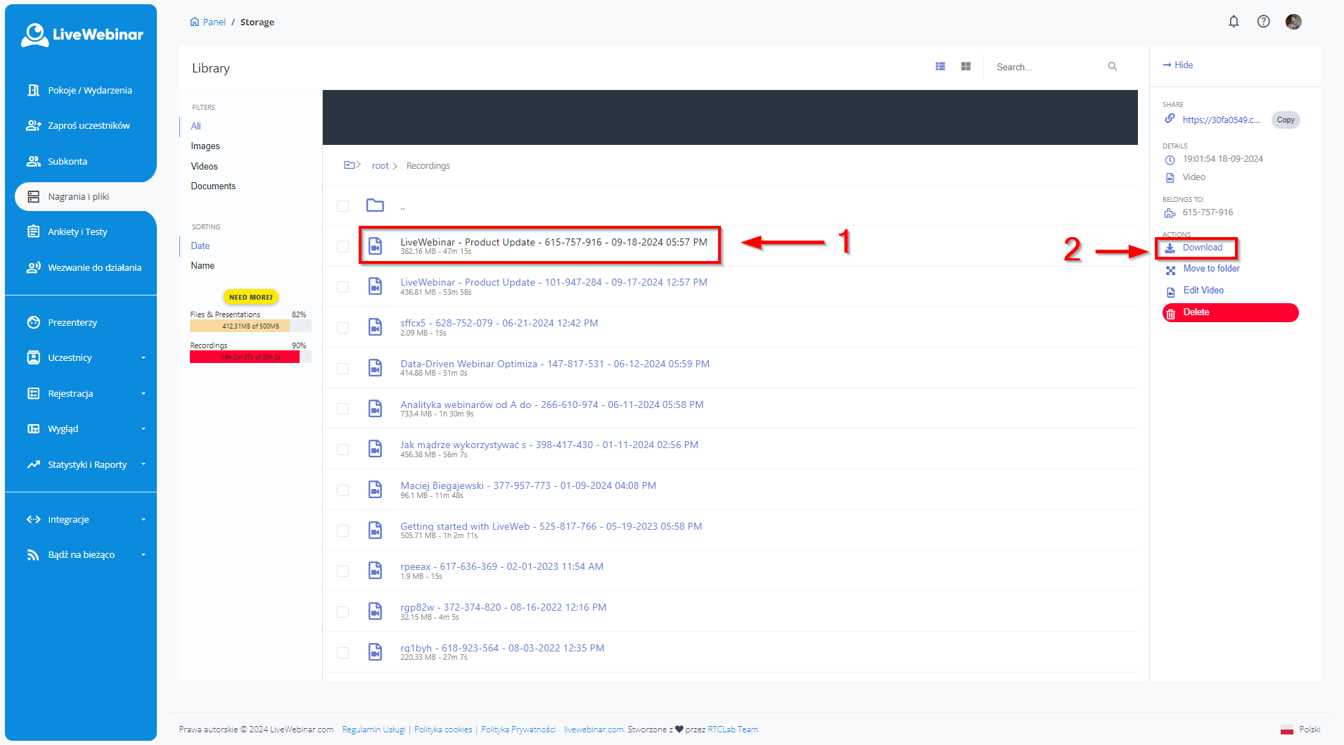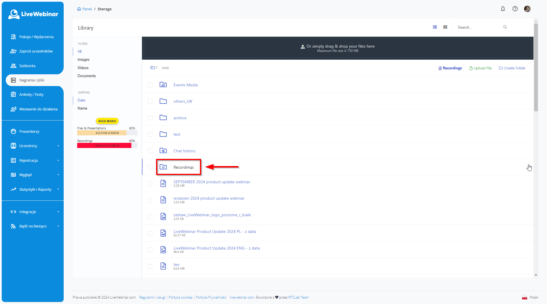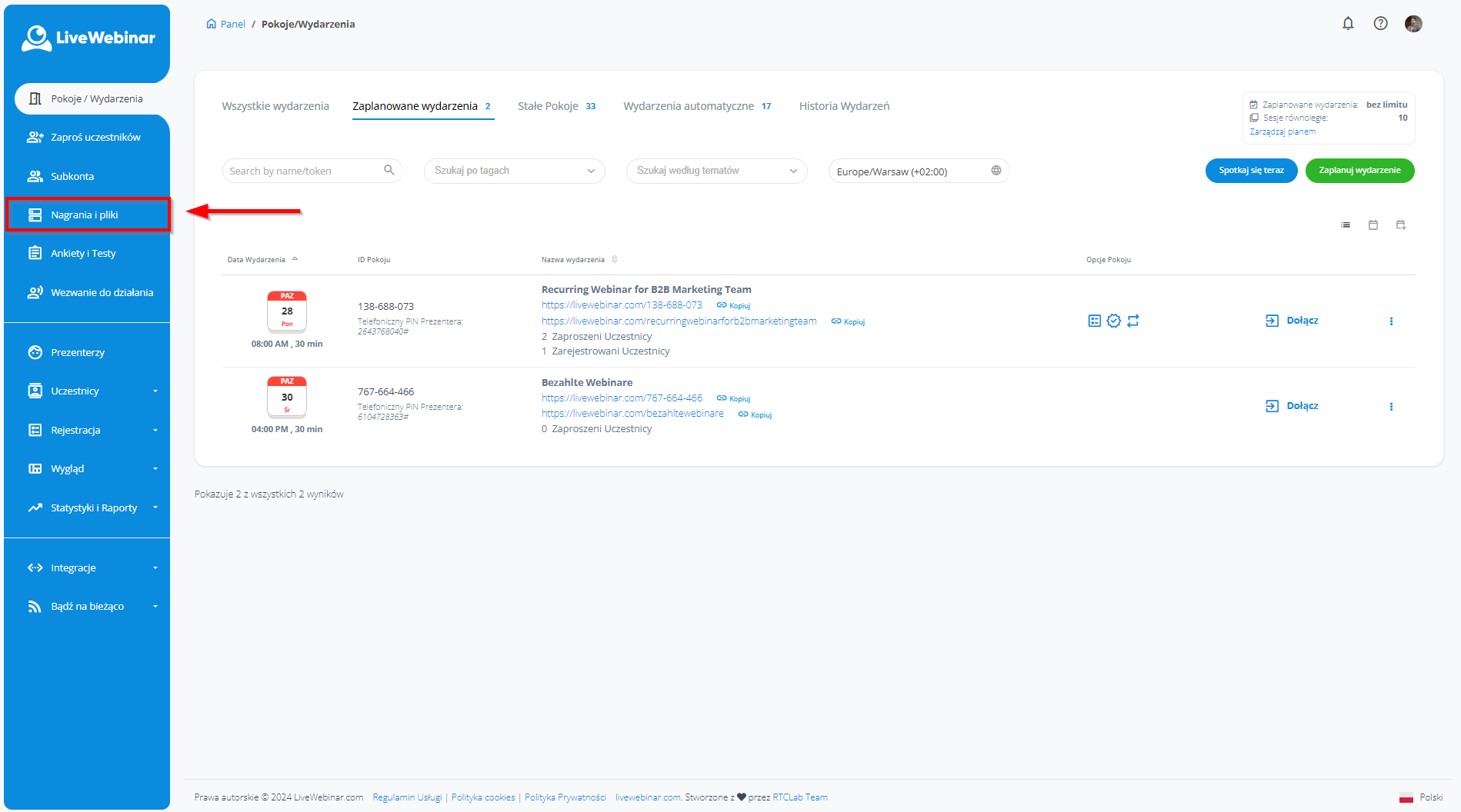 Dotychczas zgromadzone nagrania możesz znaleźć w sekcji "Nagrania i Pliki" w menu po lewej stronie głównego pulpitu w narzędziu.