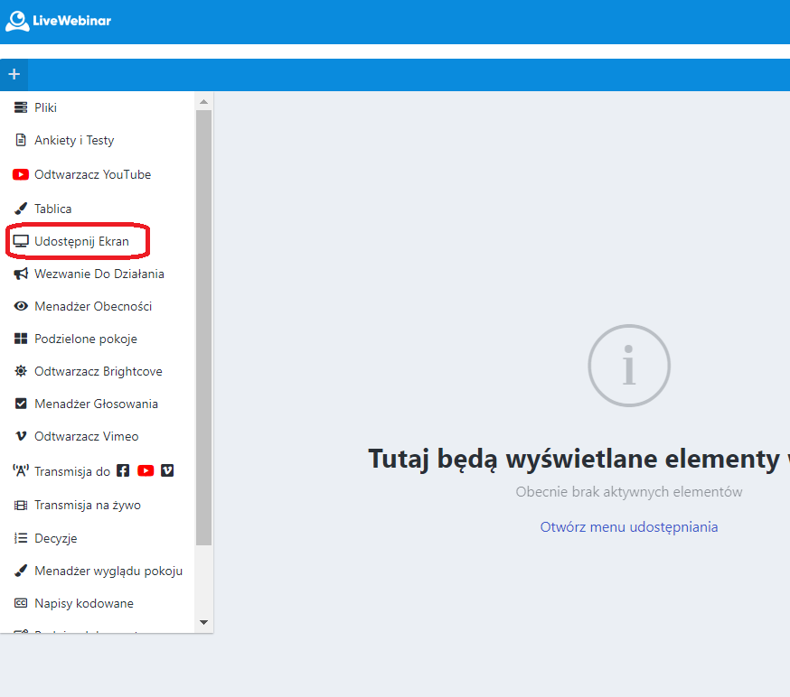 Dzielenie Ekranu jest funkcjonalnością, która jest dostępna jedynie dla Uczestnika z rolą