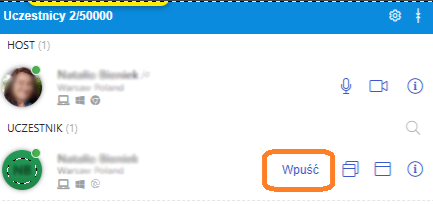 1. Możesz wpuścić uczestników indywidualnie. Przejdź do listy uczestników i kliknij przycisk „Wpuść” obok nazwiska osoby, którą chcesz wpuścić.