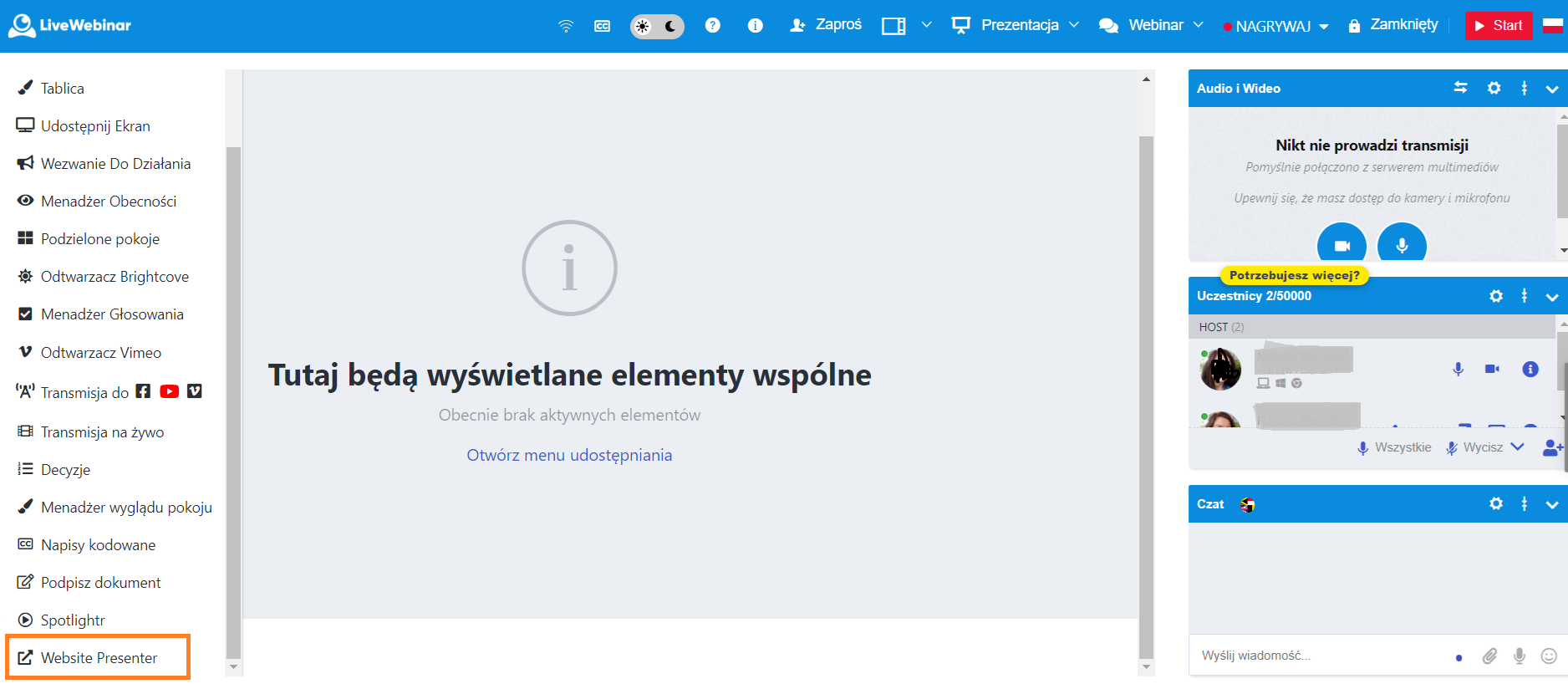 Website Presenter to funkcjonalność umożliwiająca wyświetlanie strony internetowej w oknie elementów wspólnych dla wszystkich uczestników spotkania. Dzięki temu możliwa jest efektywna kooperacja z wykorzystaniem współdzielonych dokumentów, a także zewnętrznych narzędzi do współpracy zdalnej.