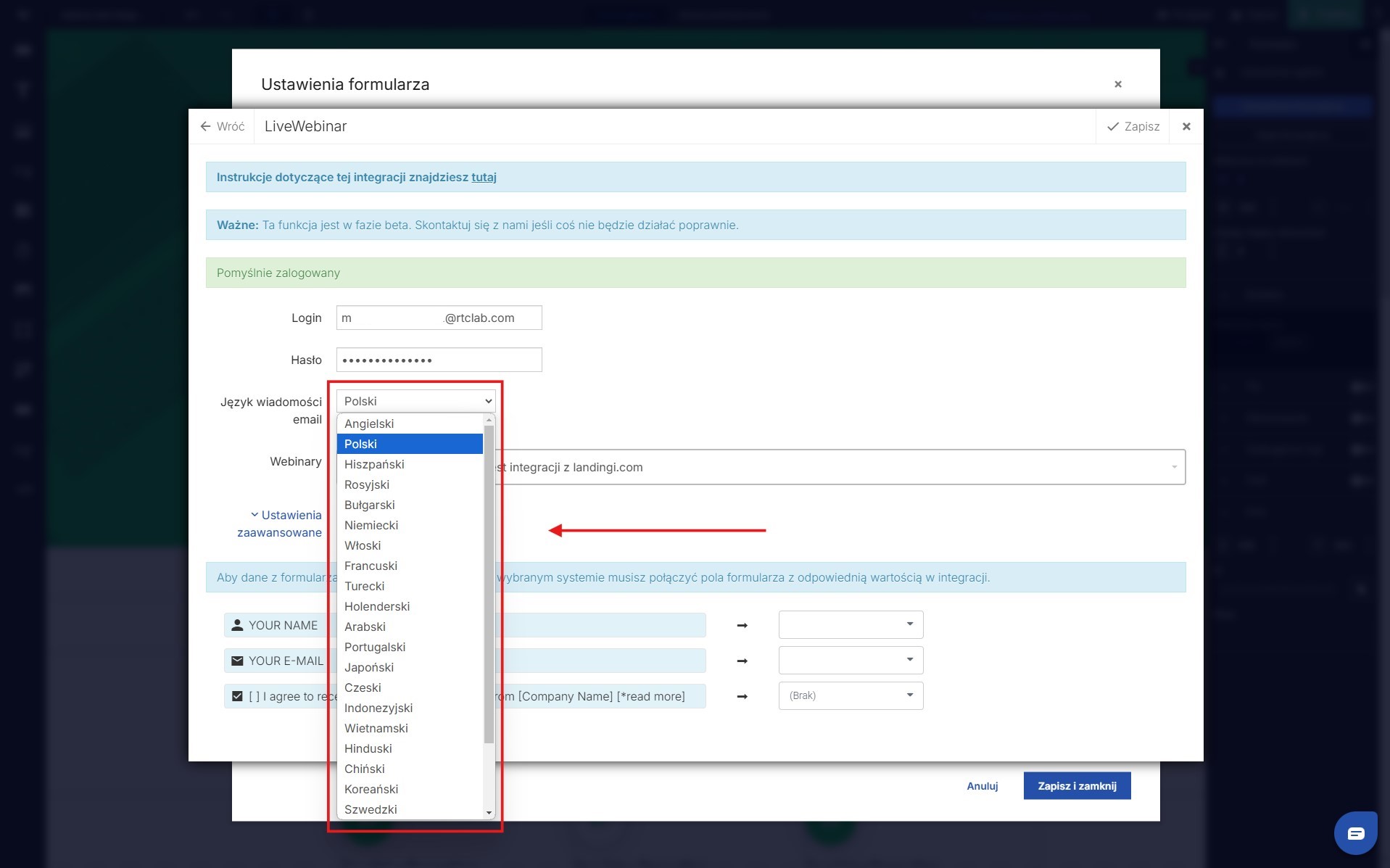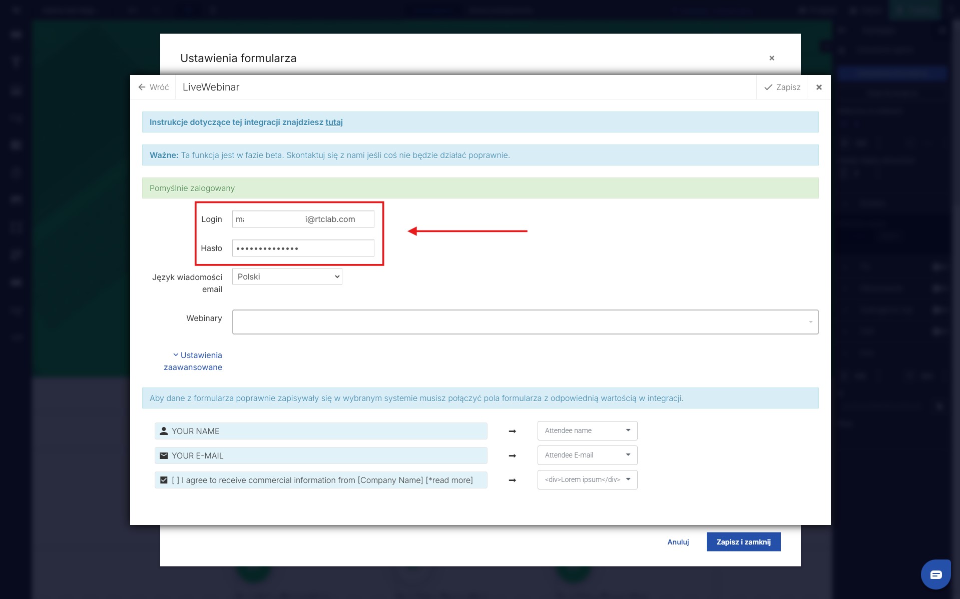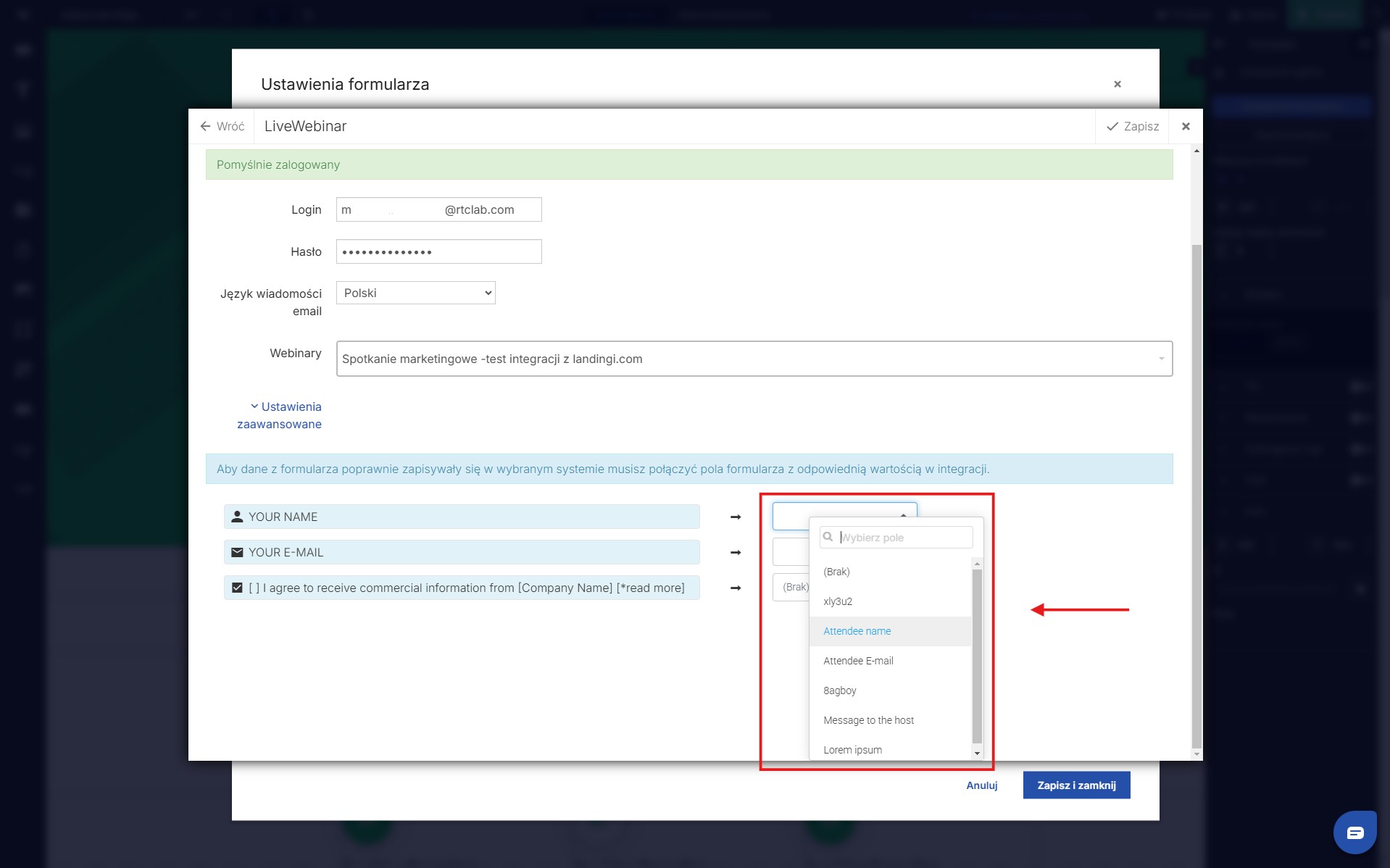 7. Pamiętaj, aby odpowiednio dopasować pola z formularza dostępnego w kreatorze Landingi oraz tego przypisanego do wydarzenie na platformie LiveWebinar.