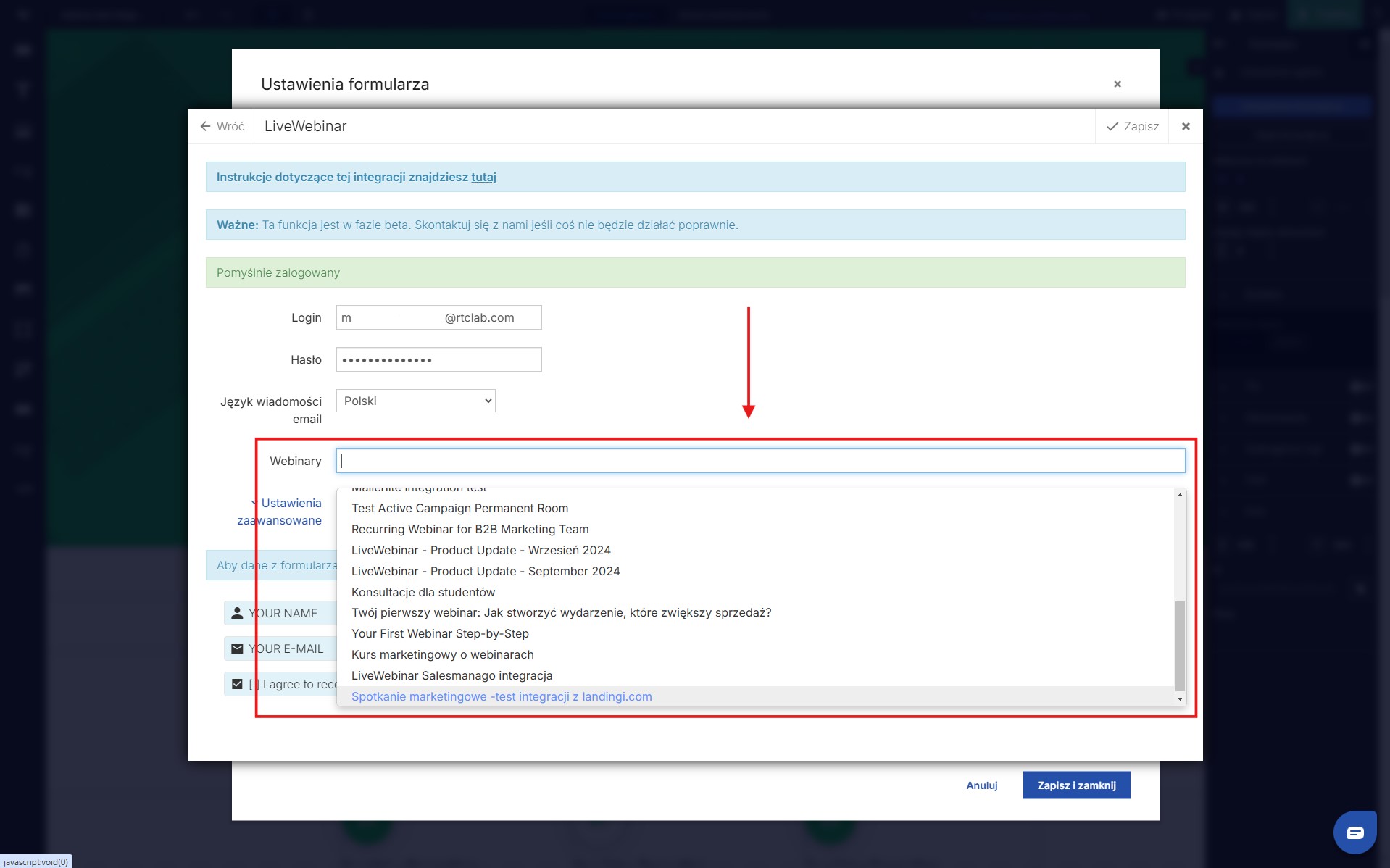7. Teraz możesz z listy webinarów wybrać ten, do którego trafiać mają zapisy z formularza osadzonego na landing page’u.