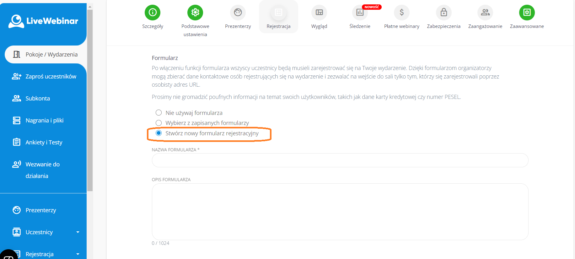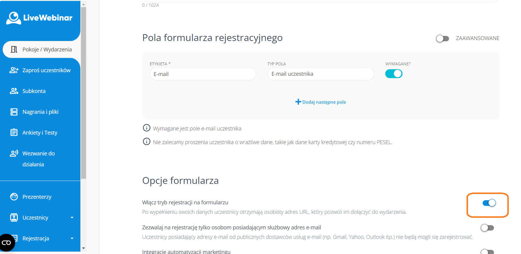 UWAGA: Od 10 lutego 2022 roku formularze rejestracyjne oraz leadowe zostały połączone w jedną opcję, znaną jako "Formularz". Możliwe jest włączenie trybu rejestracji za pomocą formularzy poprzez aktywację opcji "Włącz tryb rejestracji na formularzu".