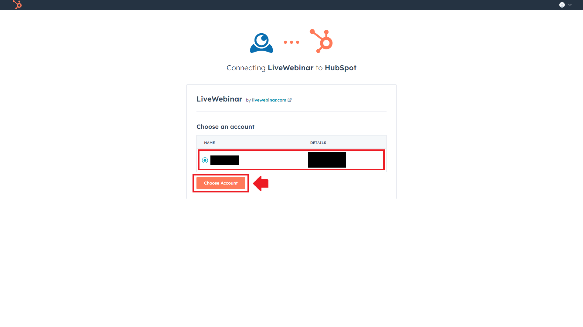 3. You will be redirected to the login page, and then log into your Hubspot account. Once you’ve logged in, select the account you want to integrate with (this can be both a regular or test account). Then, click “Choose Account”.