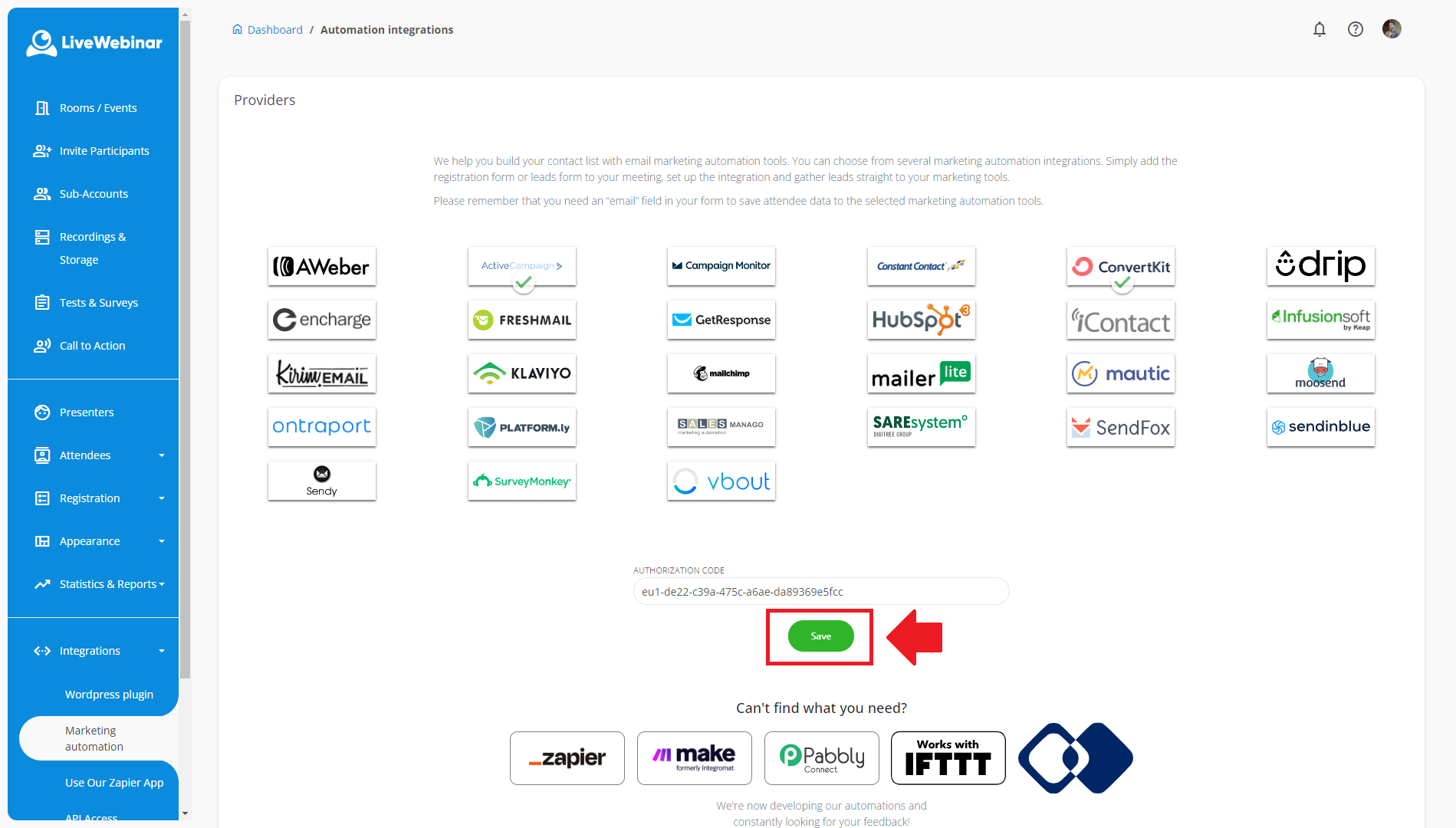 4. This step will redirect you to your LiveWebinar account. The “Authorization Code” field will be filled out automatically, and to confirm the integration, click “Save”.