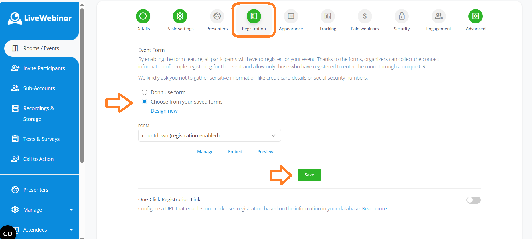 Note: Only one form can be used at a time. If both forms are enabled for your event, only the registration form will be shown.