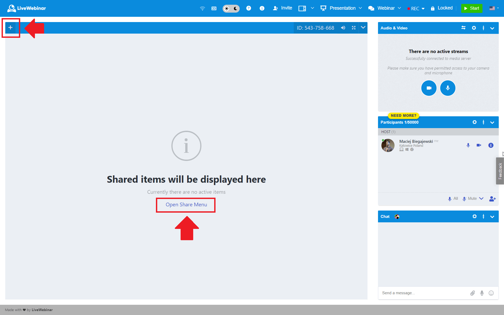 - Storage – access your account storage to share documents, presentations, and other materials.