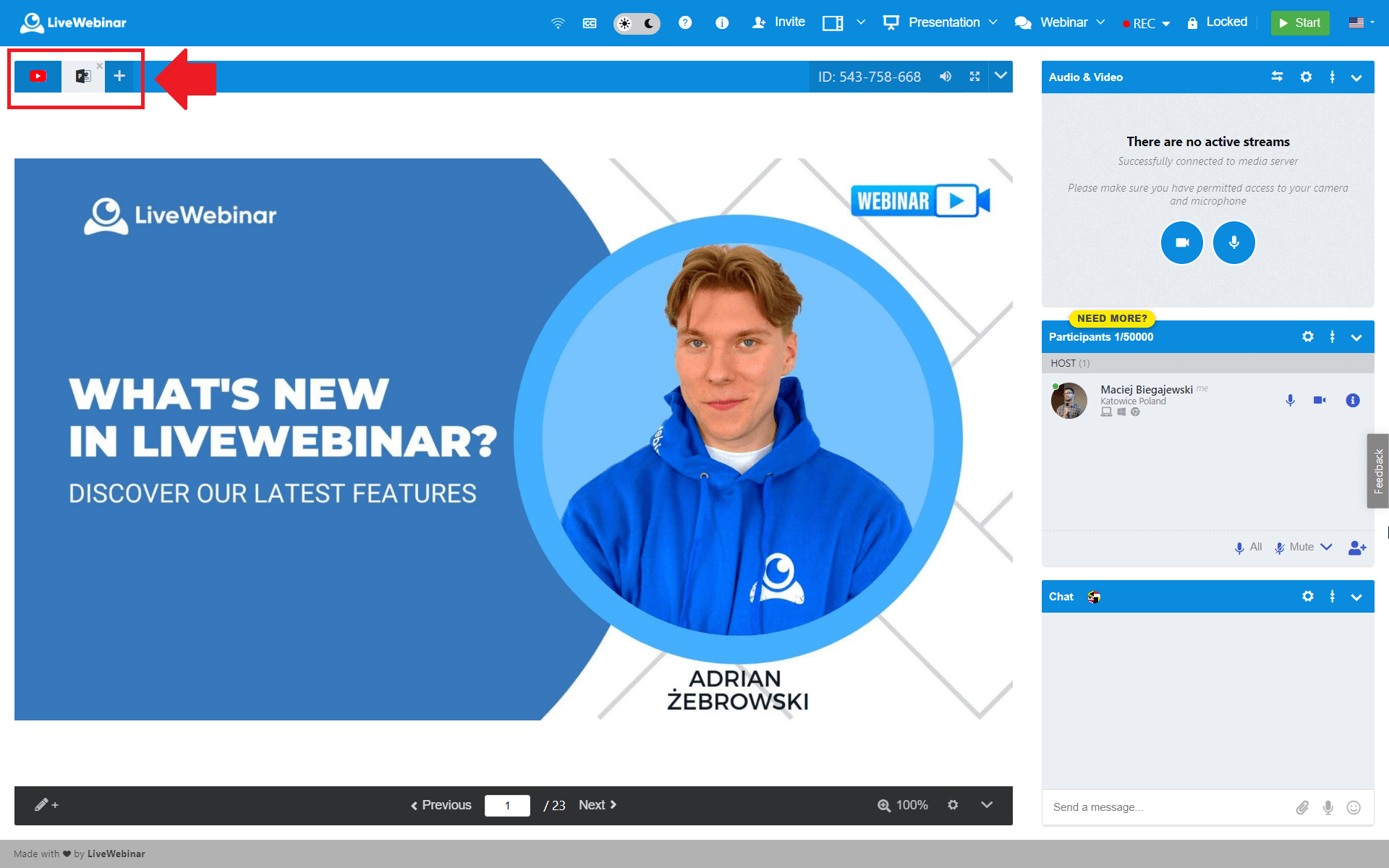You can have more than one content tab open, and you can switch between them during your event. Simply click the ‘+’ icon next to the current tab and select the feature you’d like to access next.