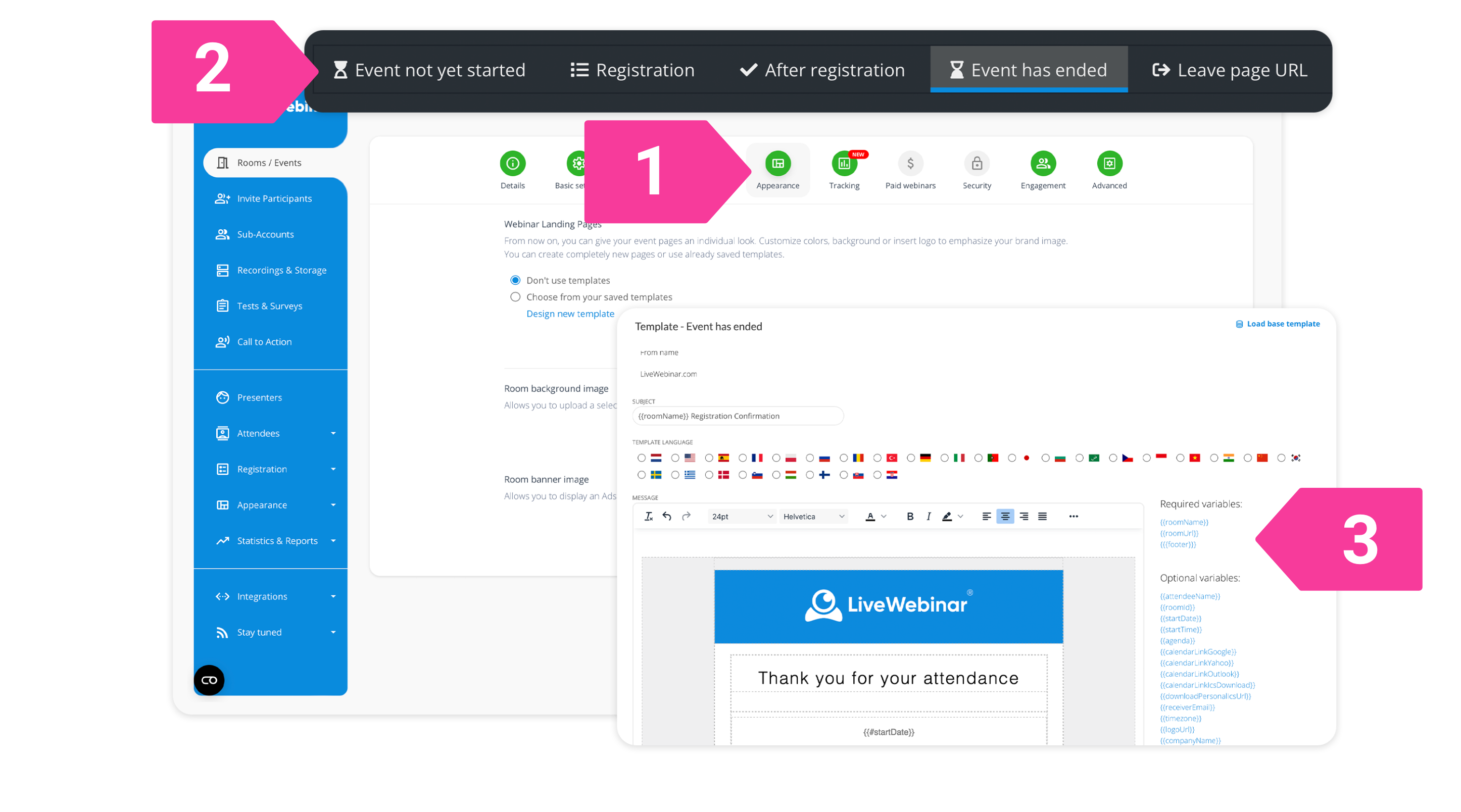With our Appearance feature, you can easily personalize your Thank-You page – create a unique design by adding branding elements, colors and links or info about your next webinar.