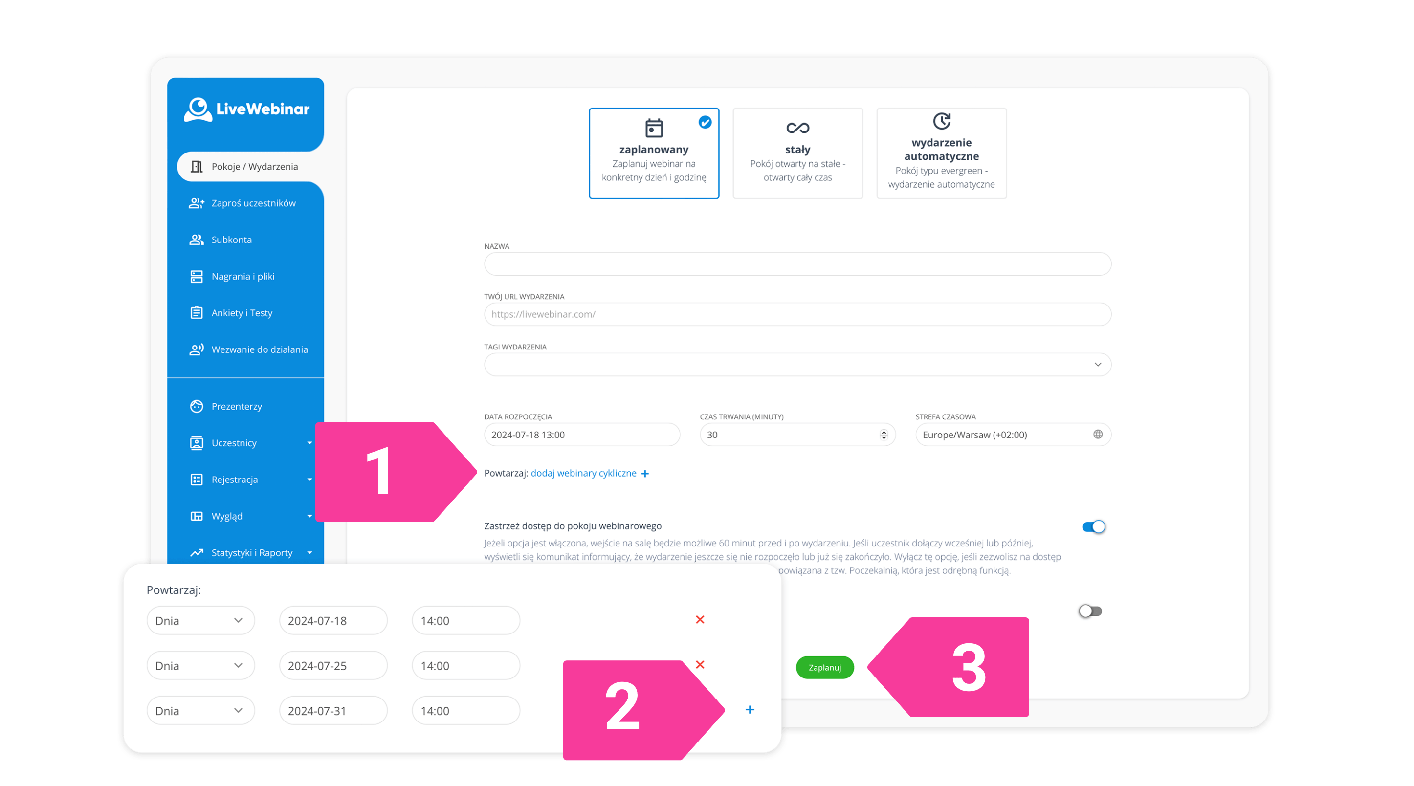 Jak ustawić webinary cykliczne?