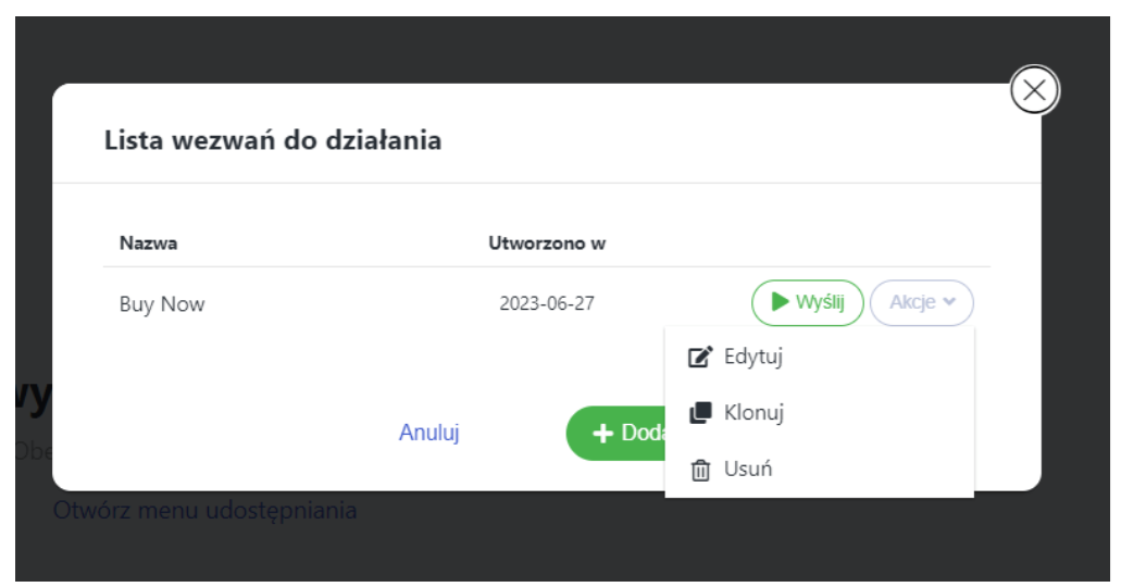 Wszystkie wcześniej utworzone CTA znajdziesz, klikając „Call to Action” w menu udostępniania.