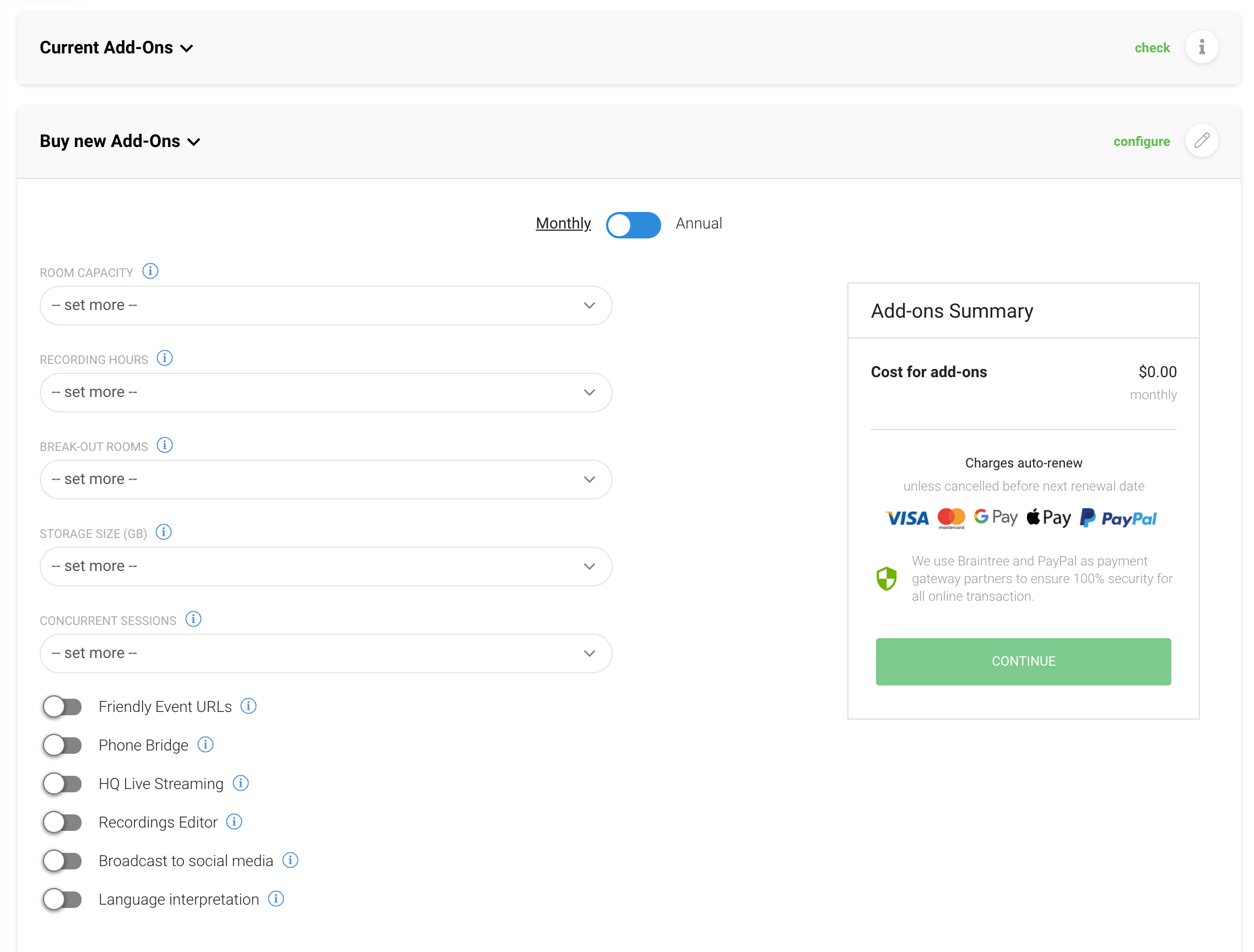 Po wprowadzeniu szczegółów płatności przejdź do karty dodatków i wybierz dodatek, który chcesz kupić. Zakup dodatków, takich jak sesje równoległe, dodatkowe godziny nagrywania lub dodatkowa przestrzeń dyskowa, odbywa się poprzez wybranie określonego pakietu na suwaku. Inne dodatki, takie jak transmisja do mediów społecznościowych, tłumacze językowi, transmisja na żywo HQ, mostek telefoniczny, przyjazne adresy URL lub edytor nagrań, można kupić, wybierając daną funkcję.