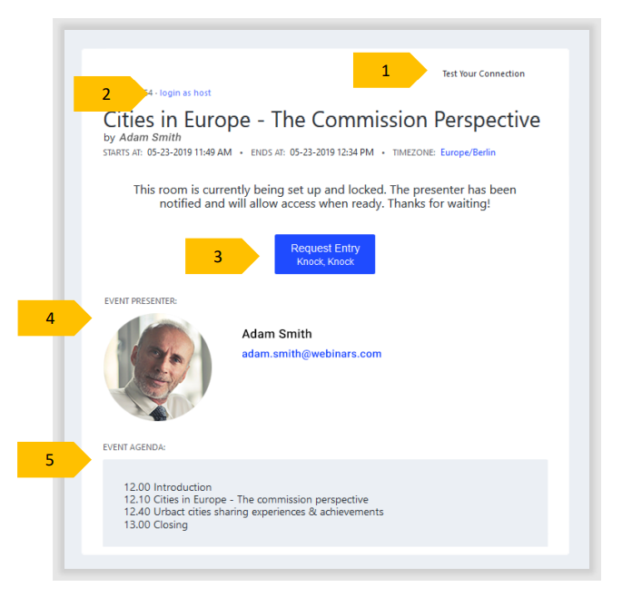 - Request Entry – click here to send a request to the host or presenter that you’d like to enter the room.