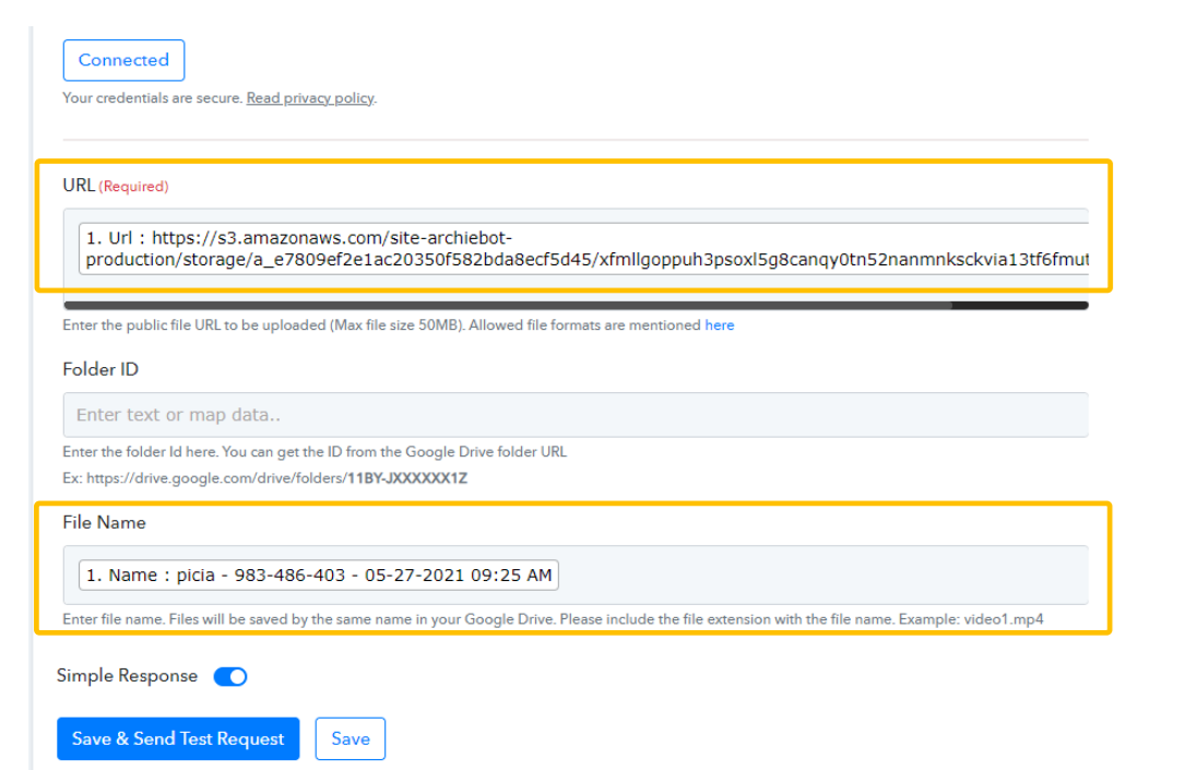 In the mandatory URL field, select "1. URL: ” this is how we indicate to our Google Drive the direct path to the created recording. In the File Name field we can choose the option "1.Name: ”, thus retaining the original name of the recording.