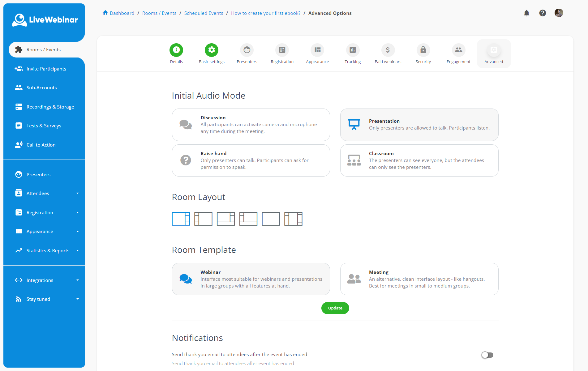 In LiveWebinar, the advanced settings are your control panel for crafting the perfect webinar environment. Choose your audio mode, pick a room layout that complements your content, and customize chat settings to foster meaningful audience interaction.