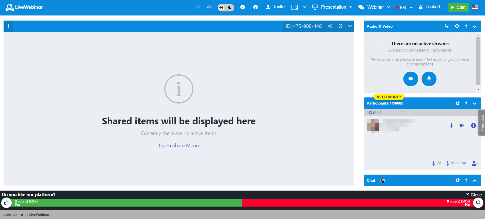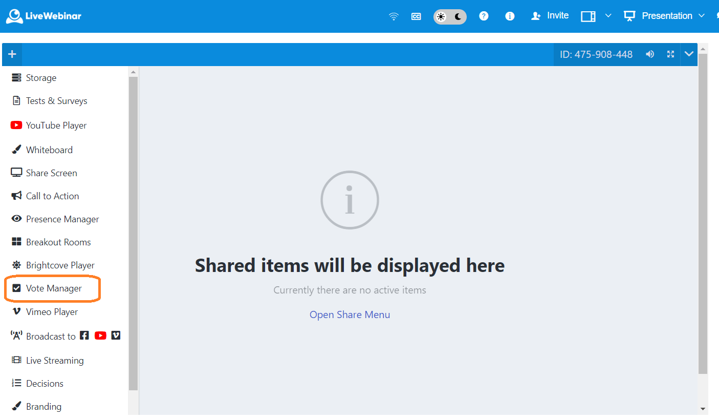 To use the Vote Manager function, first create an event and enter the webinar room. In the left side navbar, you'll see the option "Vote Manager." Select it.