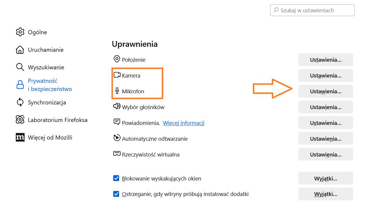 Inny sposób na włączenie kamery i mikrofonu w przeglądarce Firefox: