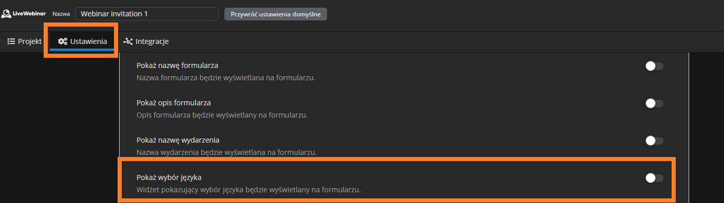 Na górnej belce znajdź zakładkę "Opcje". Wejdź do niej, a zobaczysz listę ustawień. Tam znajdziesz opcję wyłączenia wyświetlania wyboru języka w formularzu.
