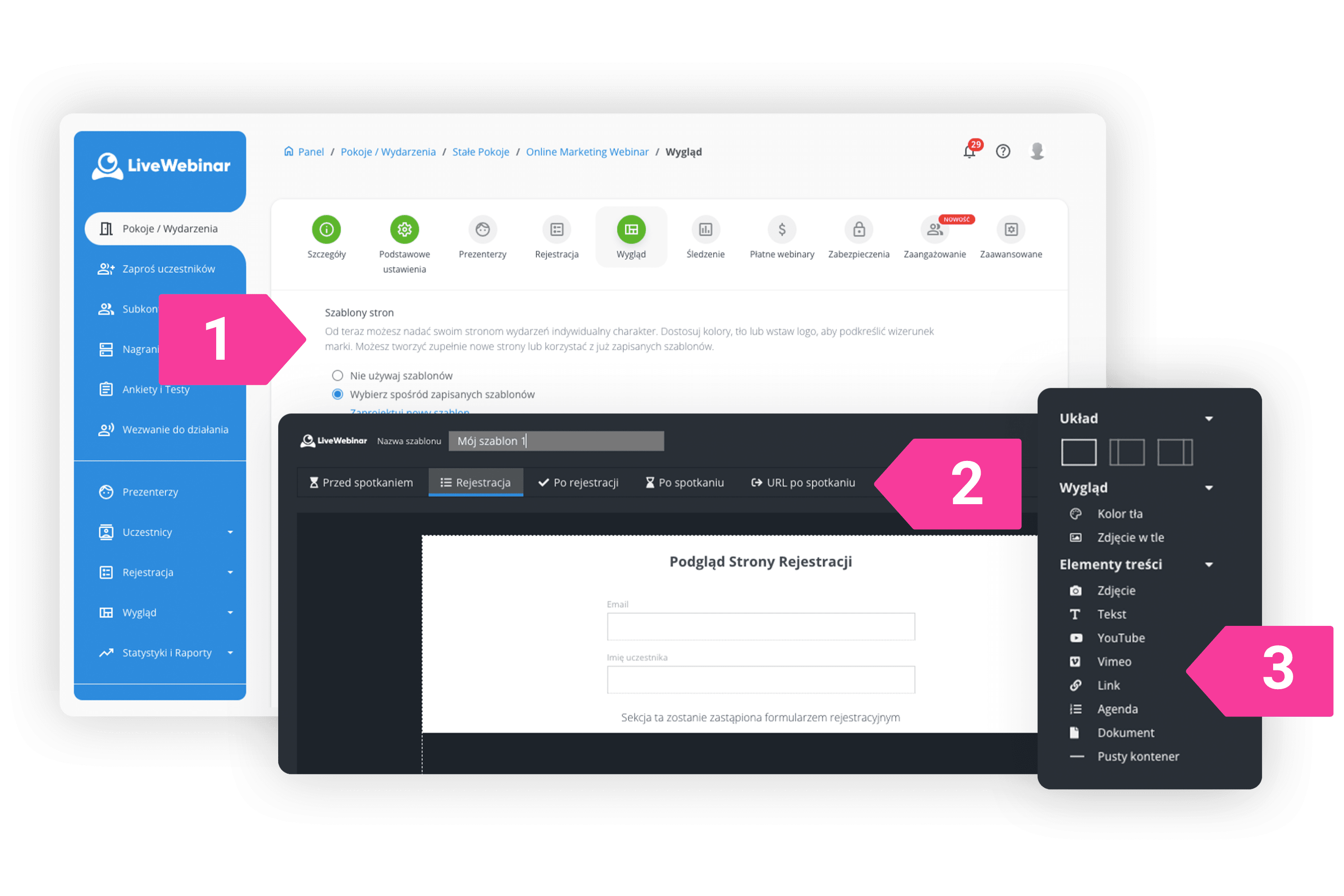 Zaprojektuj i wybierz szablony stron docelowych, które najlepiej pasują do Twojego webinaru. Wybierz kolory tła, prześlij agendę i obrazy, dostosuj układ i dodaj swoje logo.